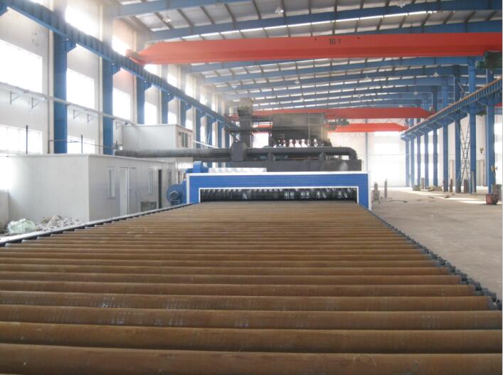 輥道通過式拋丸機是將工件吊放在輸送輥道上,輥道輸送系統將工件向前輸送,當工件進入清理室時,拋丸器開始順序工作。經過拋丸處理后,鋼材表面的氧化皮、污物及其它附著物被清理干凈,處理過的工件表面可達Sa2-2.5級。拋丸機的工作方式是連續循環進行的。